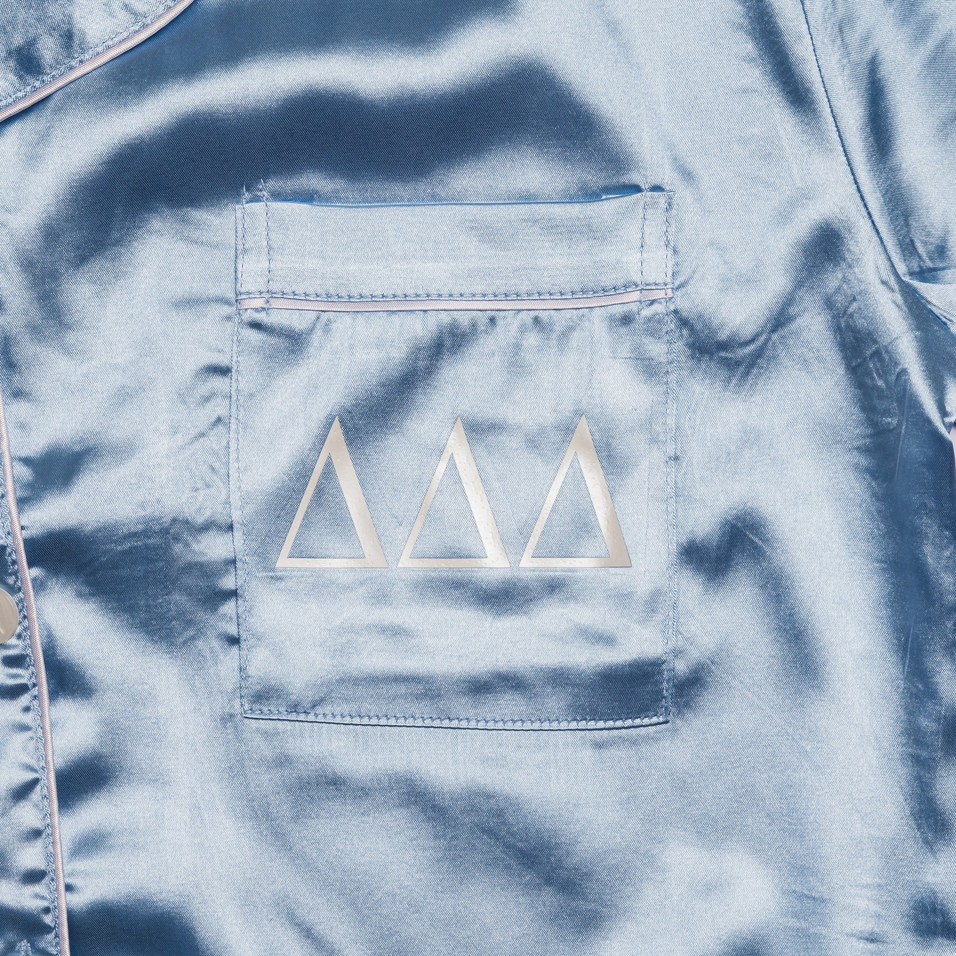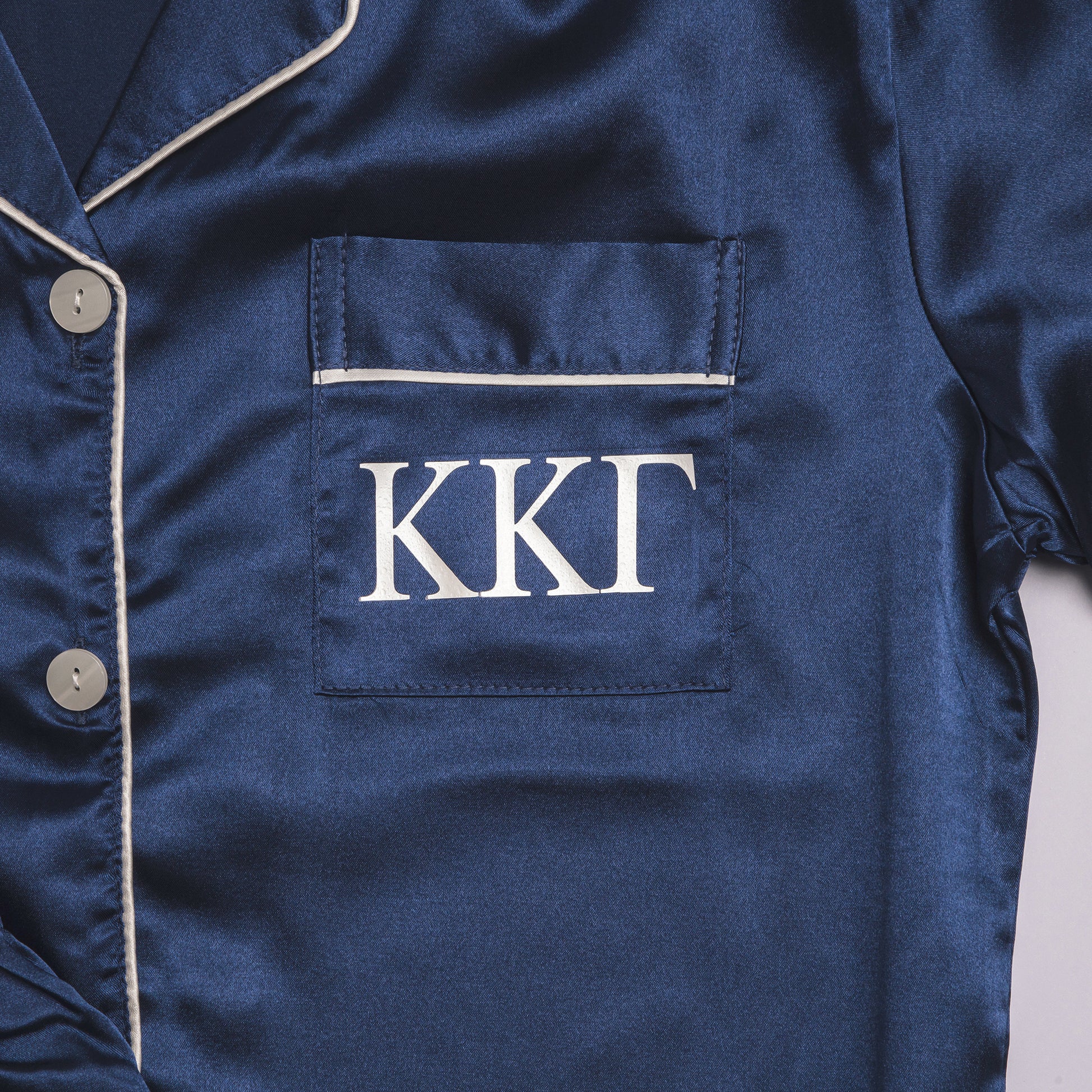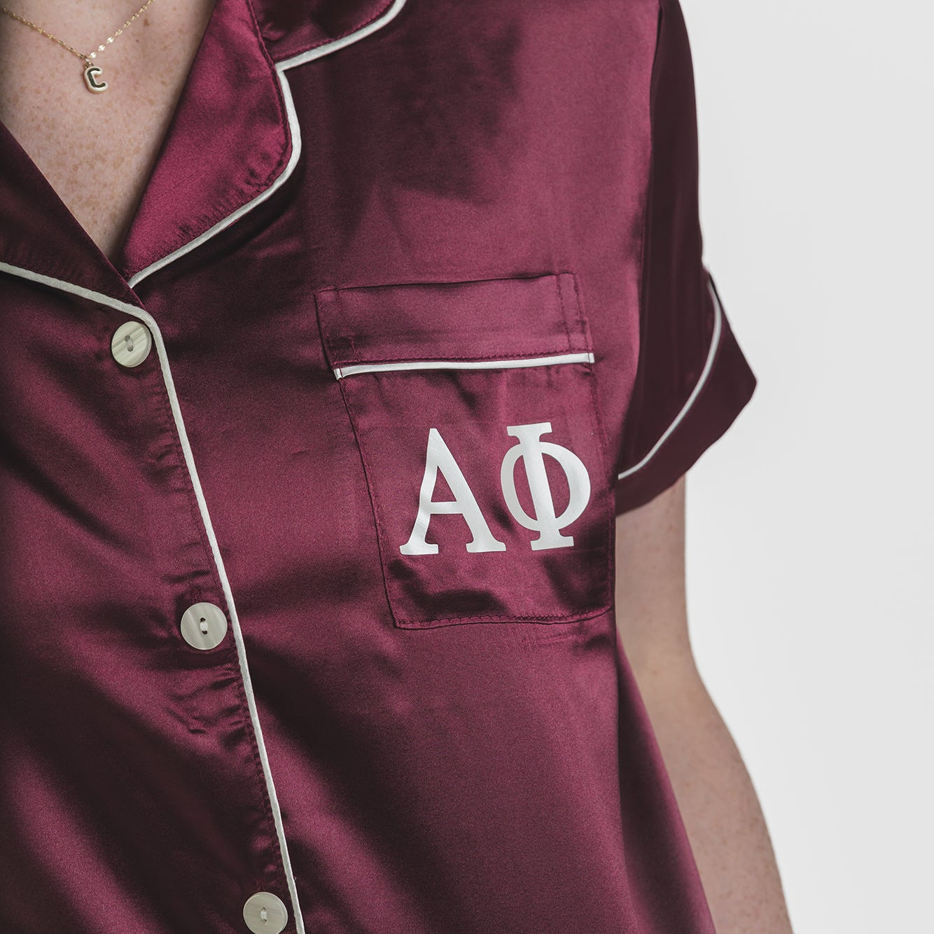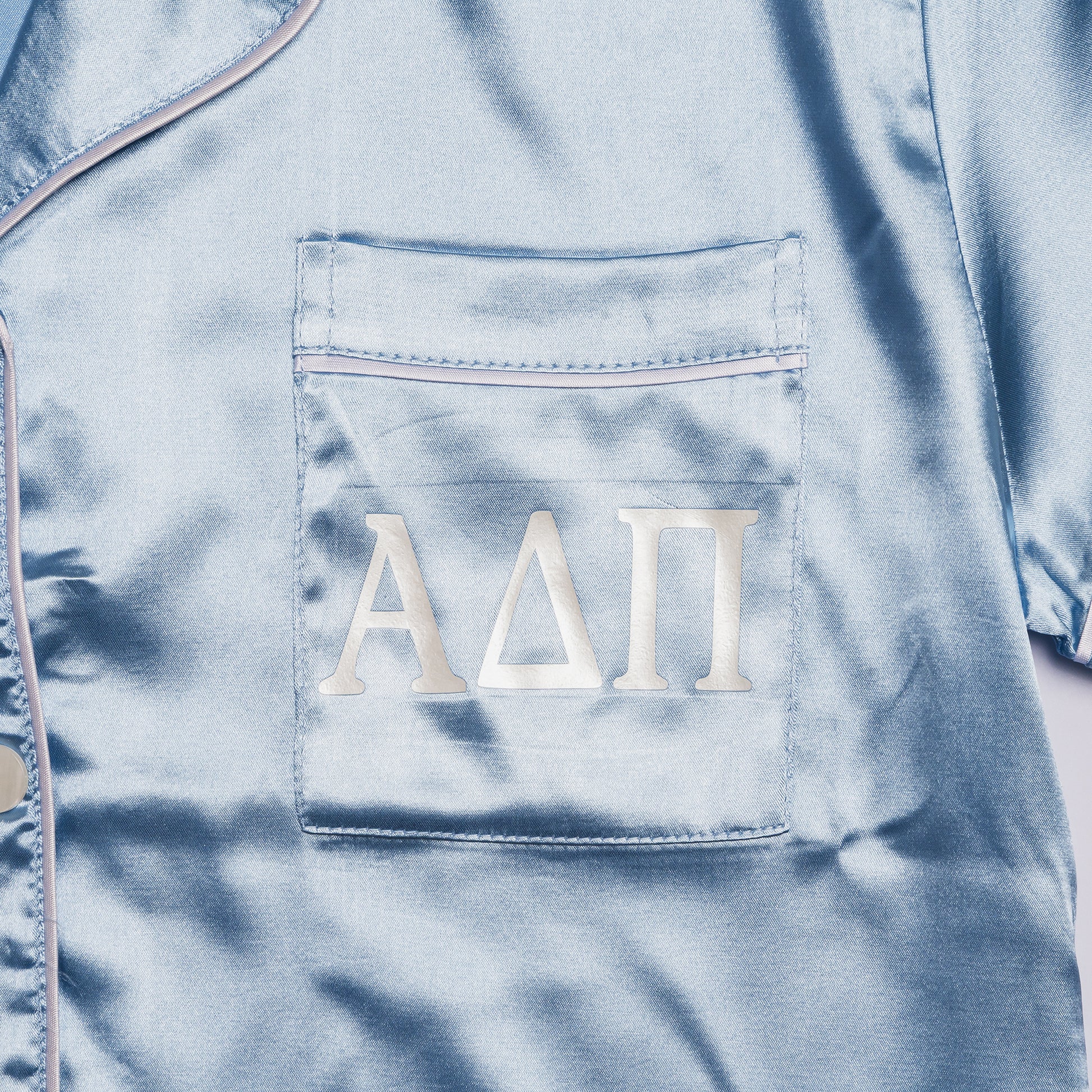 Luxe comfort meets sisterhood style. This silky, colorful pajama set features short sleeves and matching shorts for the perfect lounge fit. Each piece is finished with your sorority’s symbols on the lapel and bottoms — a subtle, stylish way to show off your letters while relaxing in total comfort.