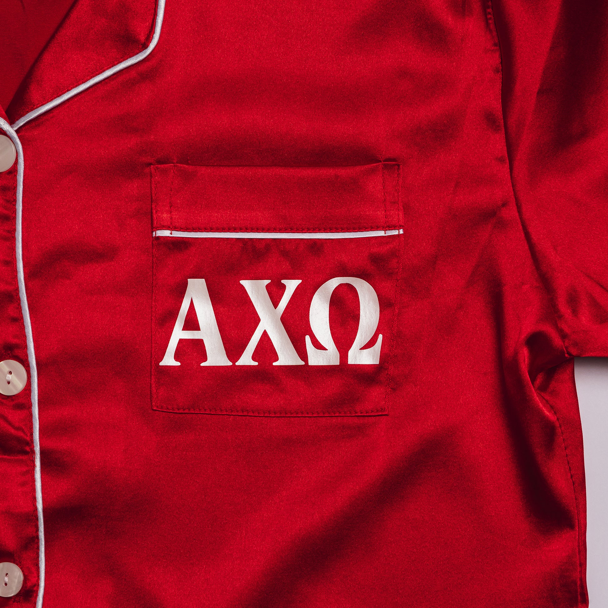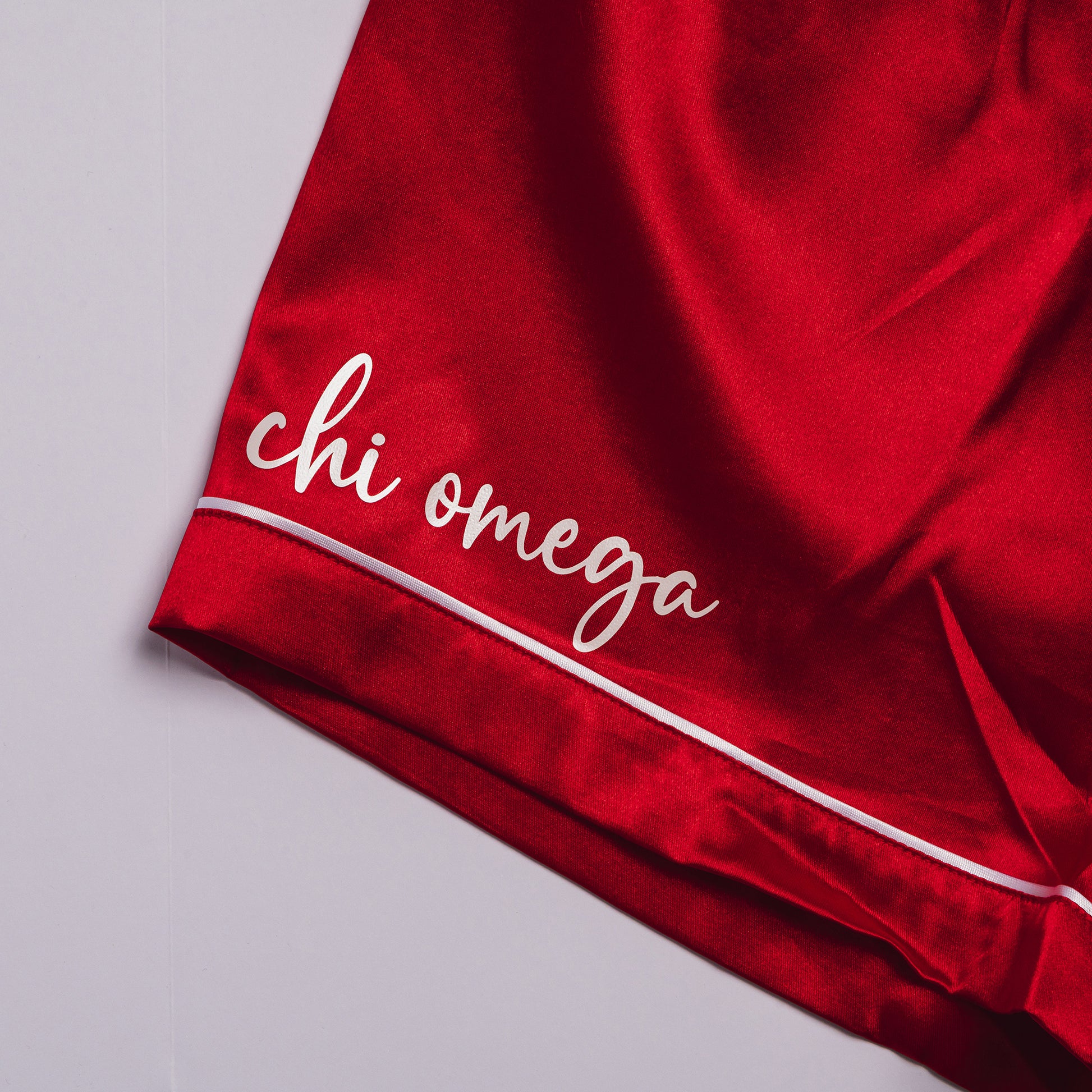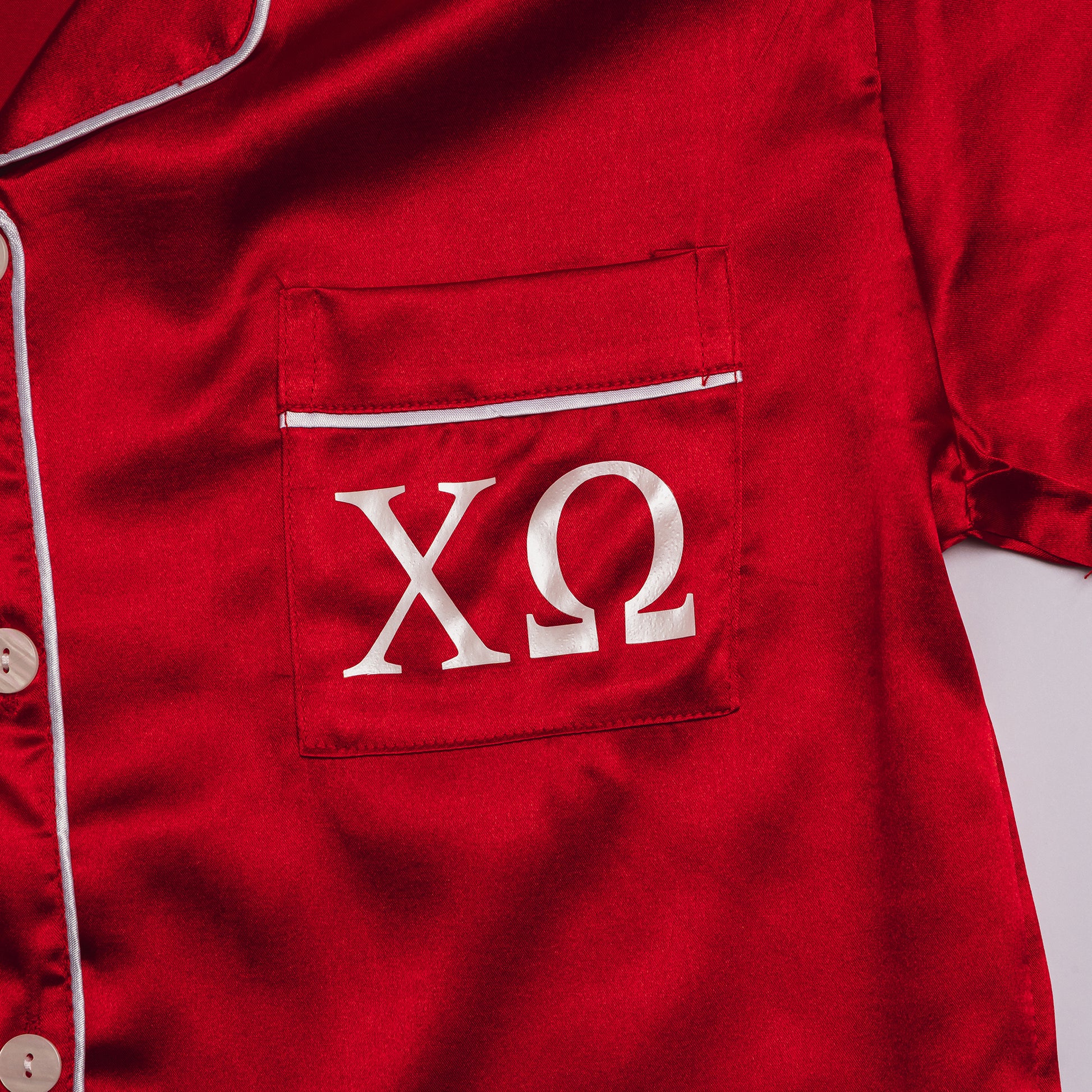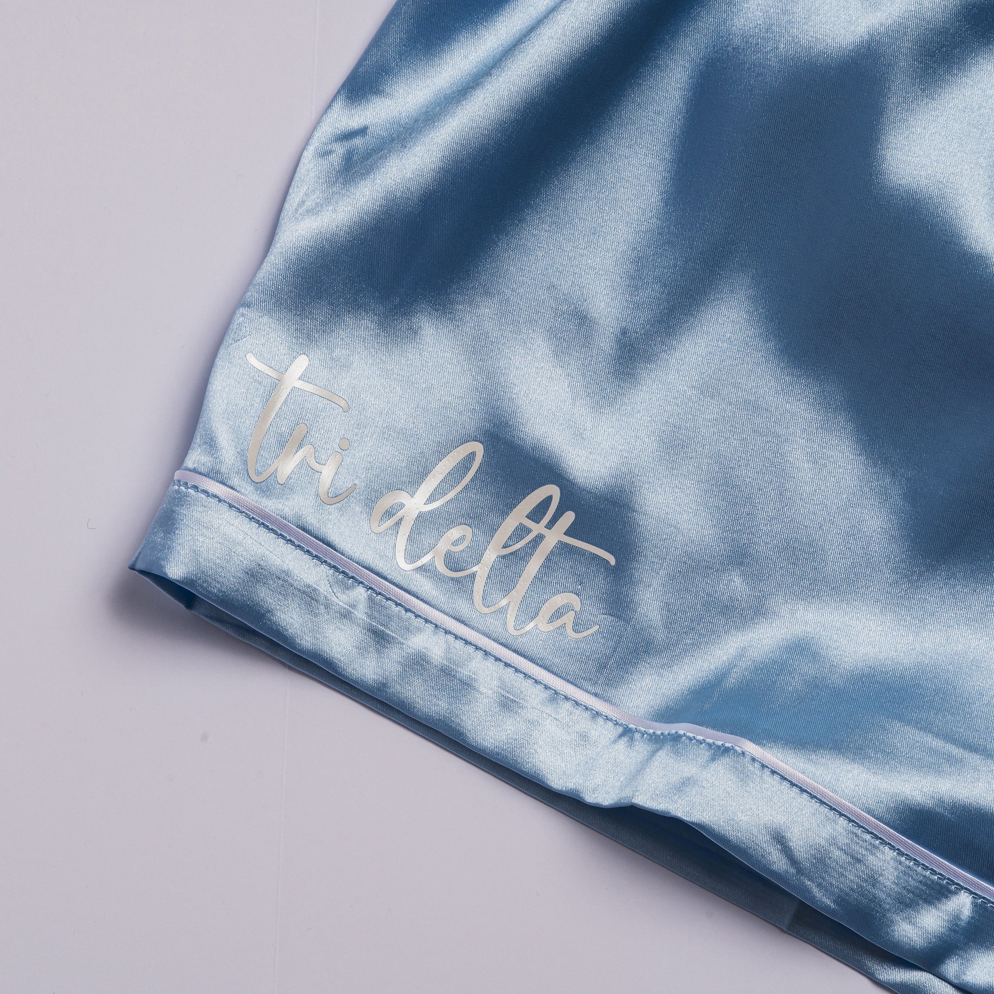 Luxe comfort meets sisterhood style. This silky, colorful pajama set features short sleeves and matching shorts for the perfect lounge fit. Each piece is finished with your sorority’s symbols on the lapel and bottoms — a subtle, stylish way to show off your letters while relaxing in total comfort.