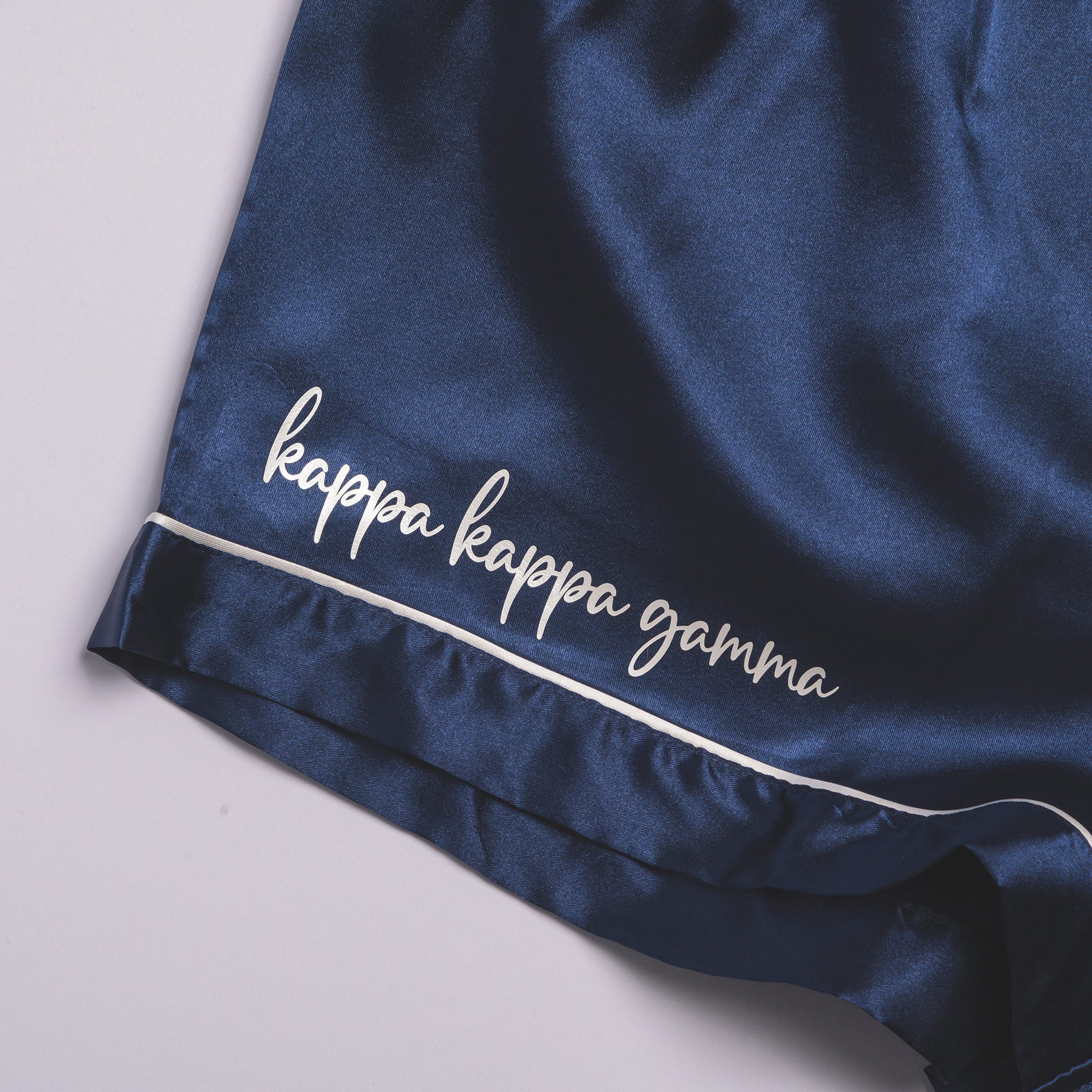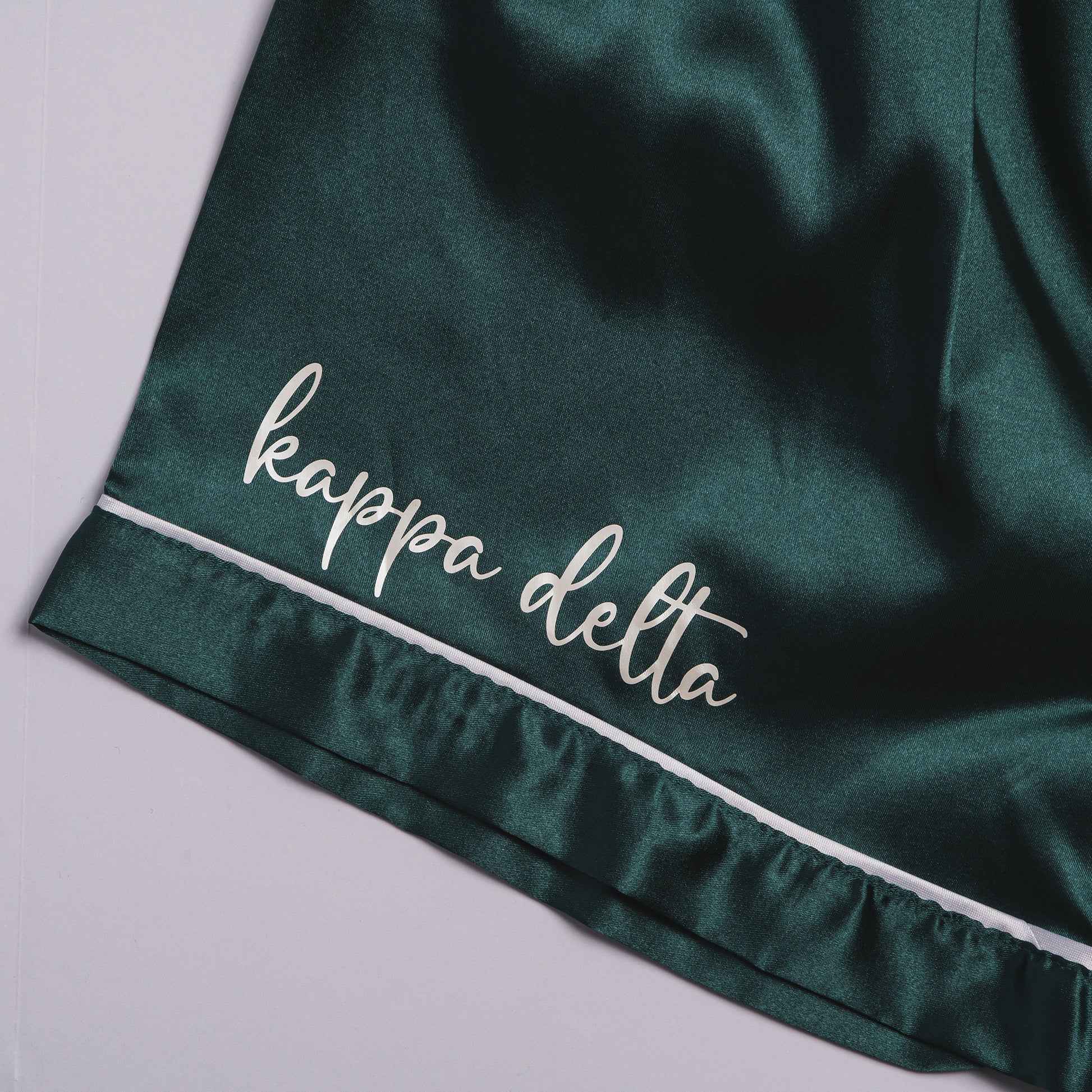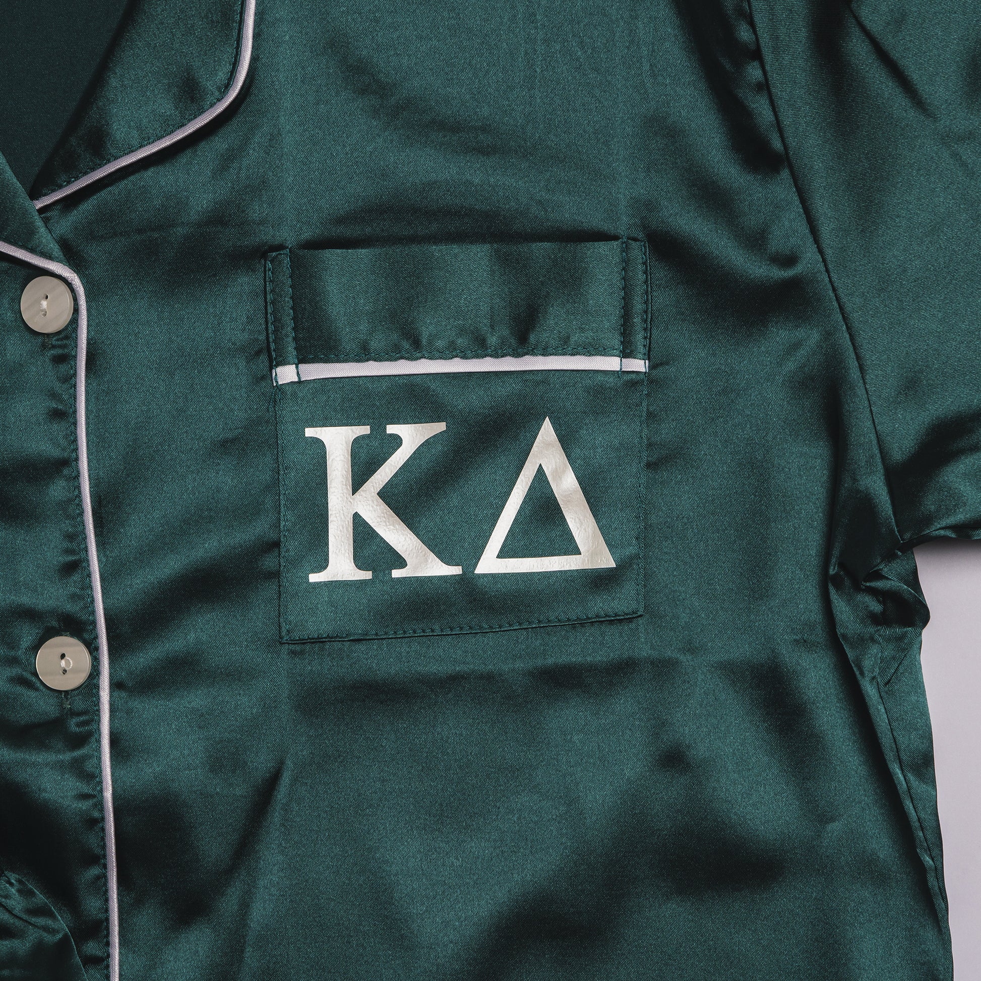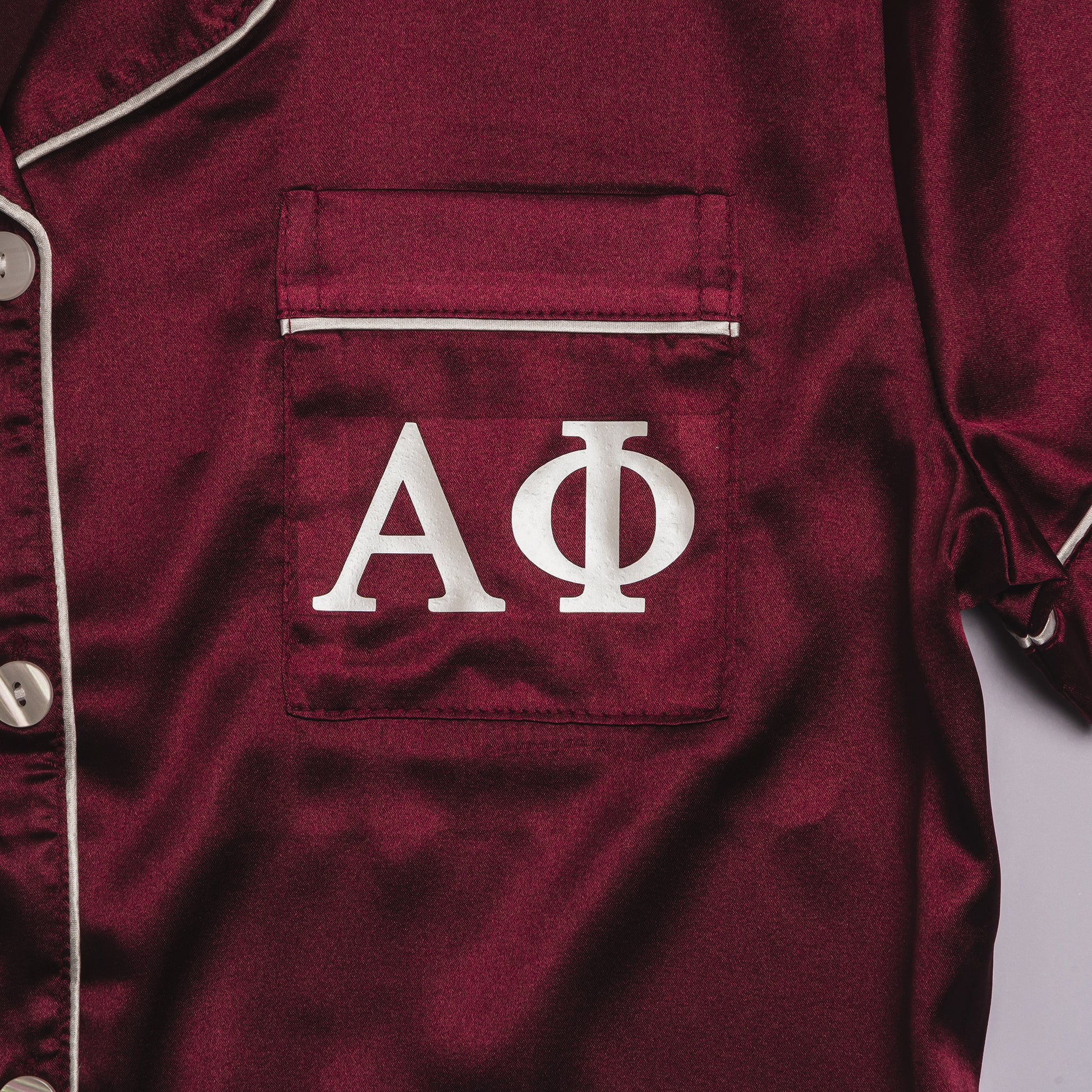 Luxe comfort meets sisterhood style. This silky, colorful pajama set features short sleeves and matching shorts for the perfect lounge fit. Each piece is finished with your sorority’s symbols on the lapel and bottoms — a subtle, stylish way to show off your letters while relaxing in total comfort.