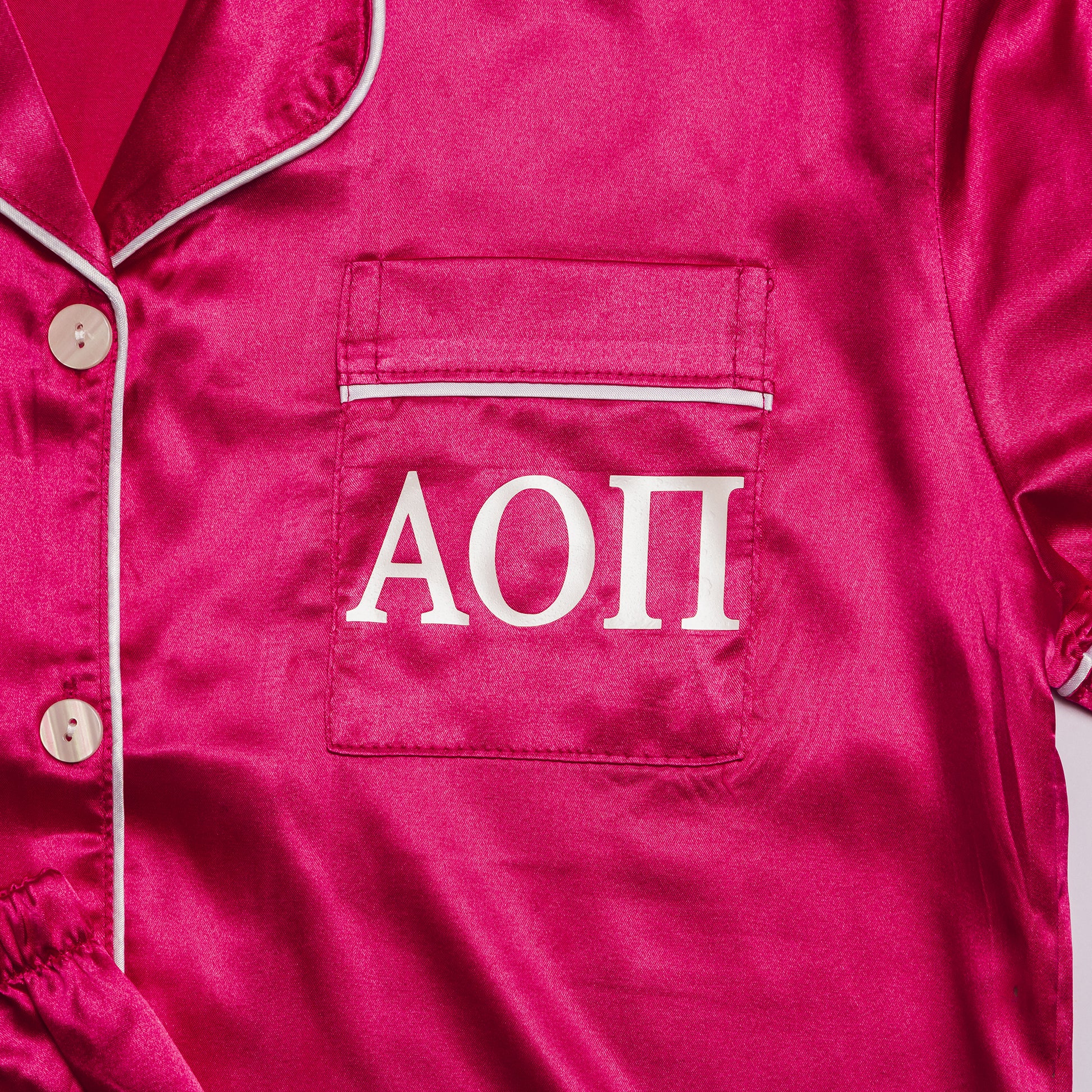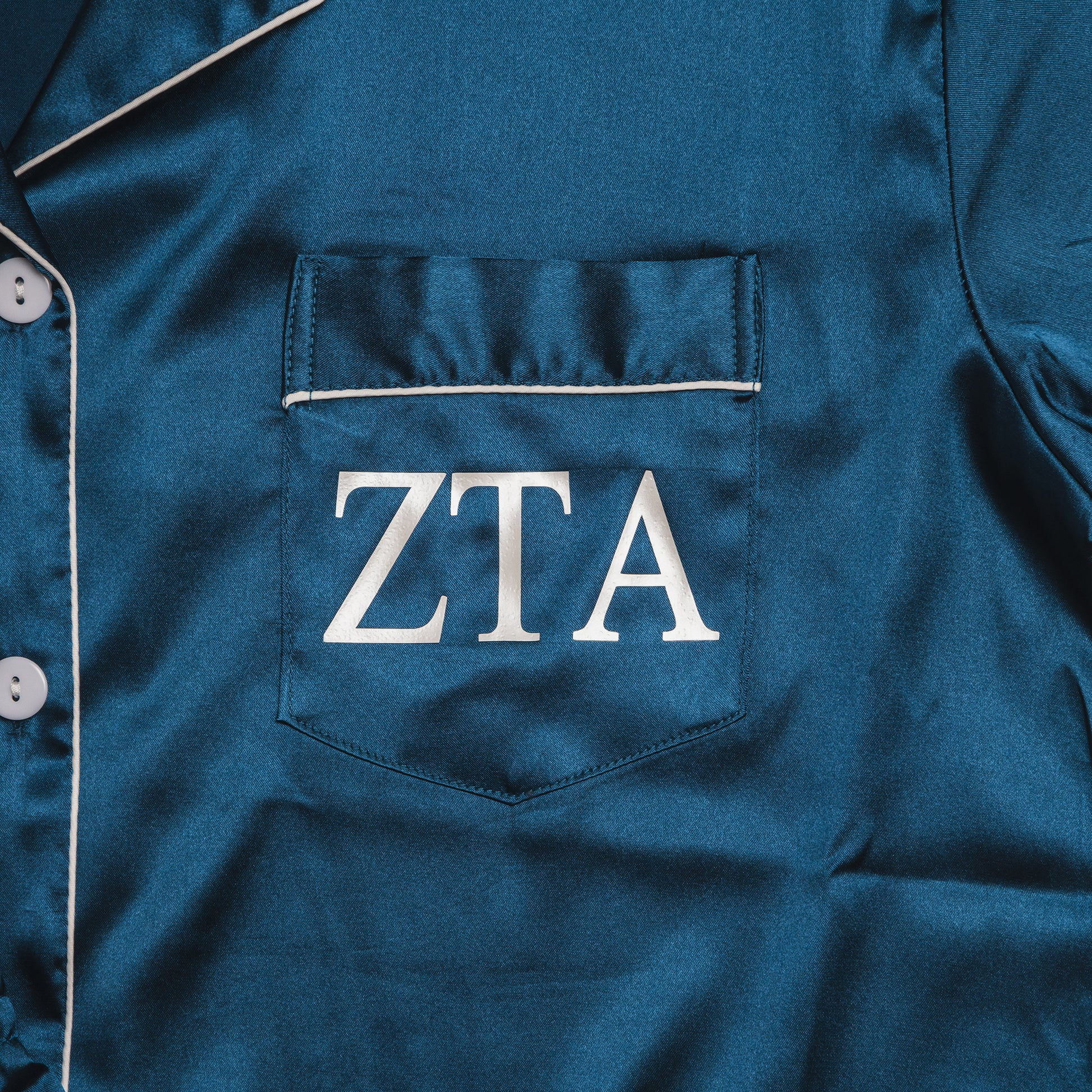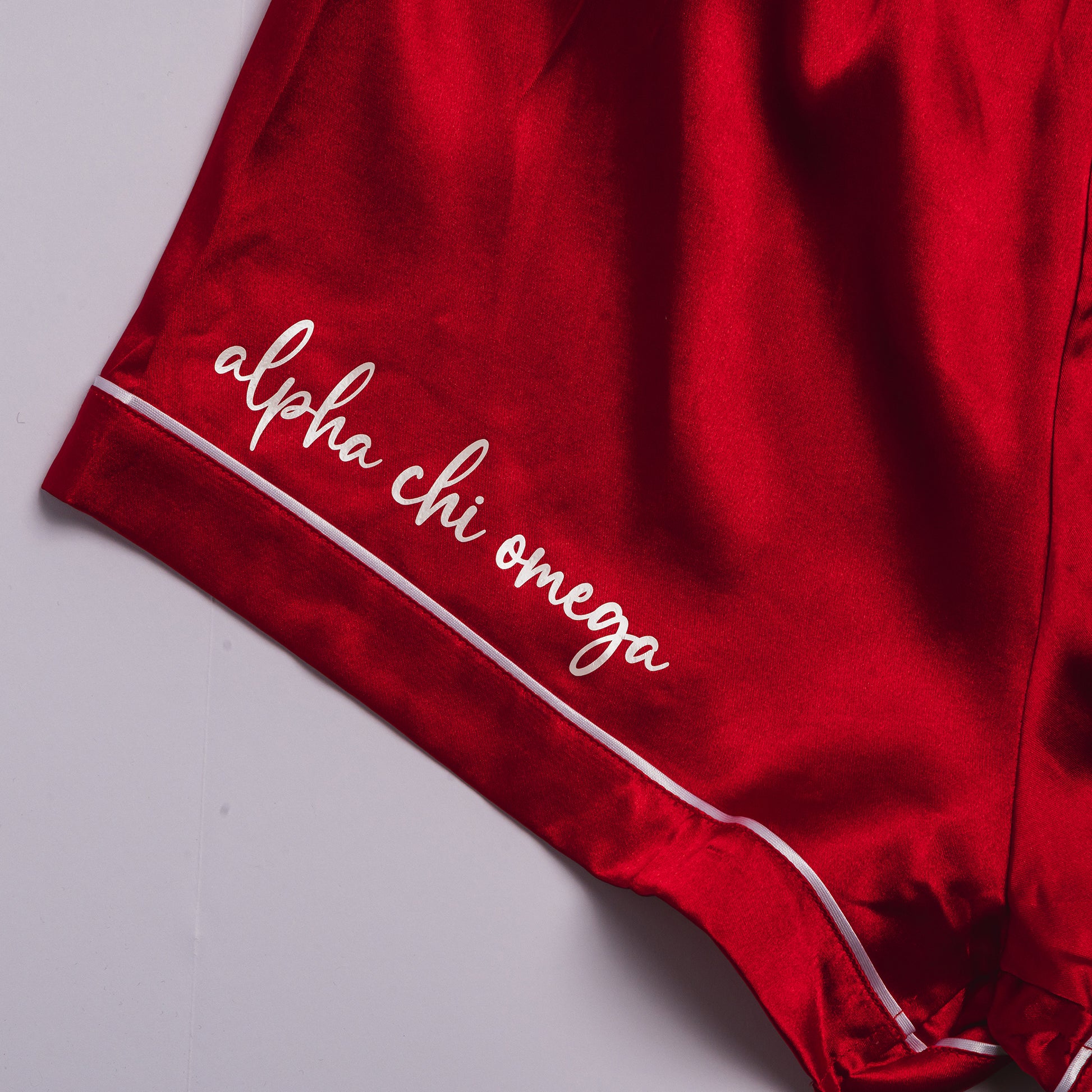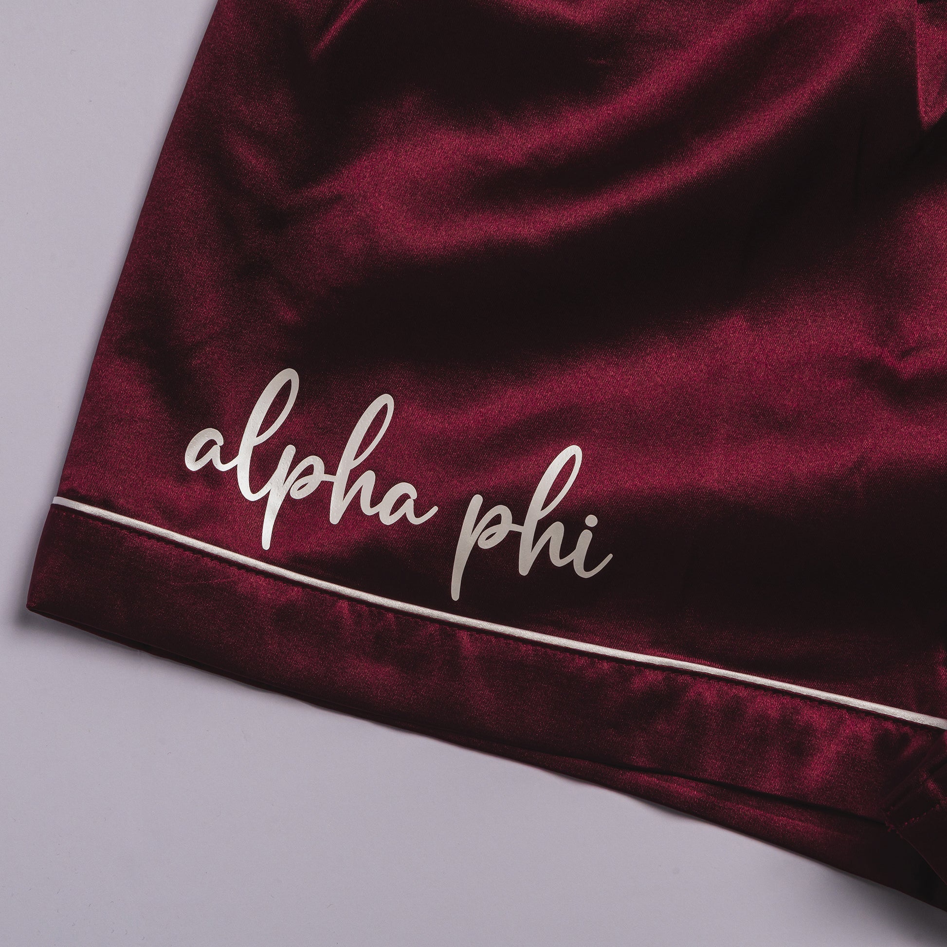 Luxe comfort meets sisterhood style. This silky, colorful pajama set features short sleeves and matching shorts for the perfect lounge fit. Each piece is finished with your sorority’s symbols on the lapel and bottoms — a subtle, stylish way to show off your letters while relaxing in total comfort.
